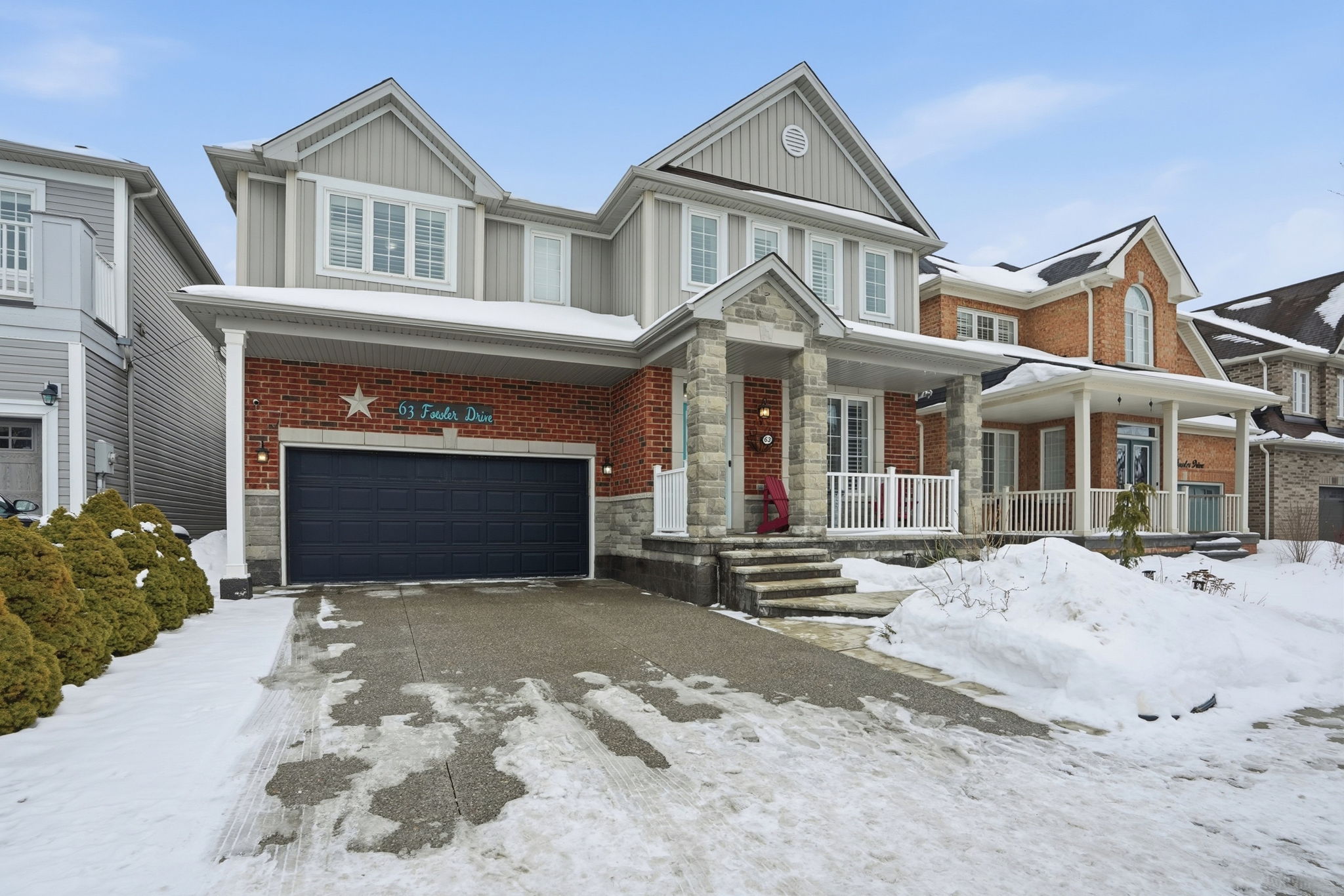 Step into luxury at 63 Fowler Drive, a stunning 2-storey executive home offering a true 2,881 square feet of refined living space above grade. Set on a premium lot in a family-first community, this home impresses immediately with a stone-accented façade and stamped concrete porch. Inside, the layout is breathtaking, featuring soaring ceilings open to the upper level in the living room, gleaming hardwood floors, and a main-floor private office perfect for working from home.